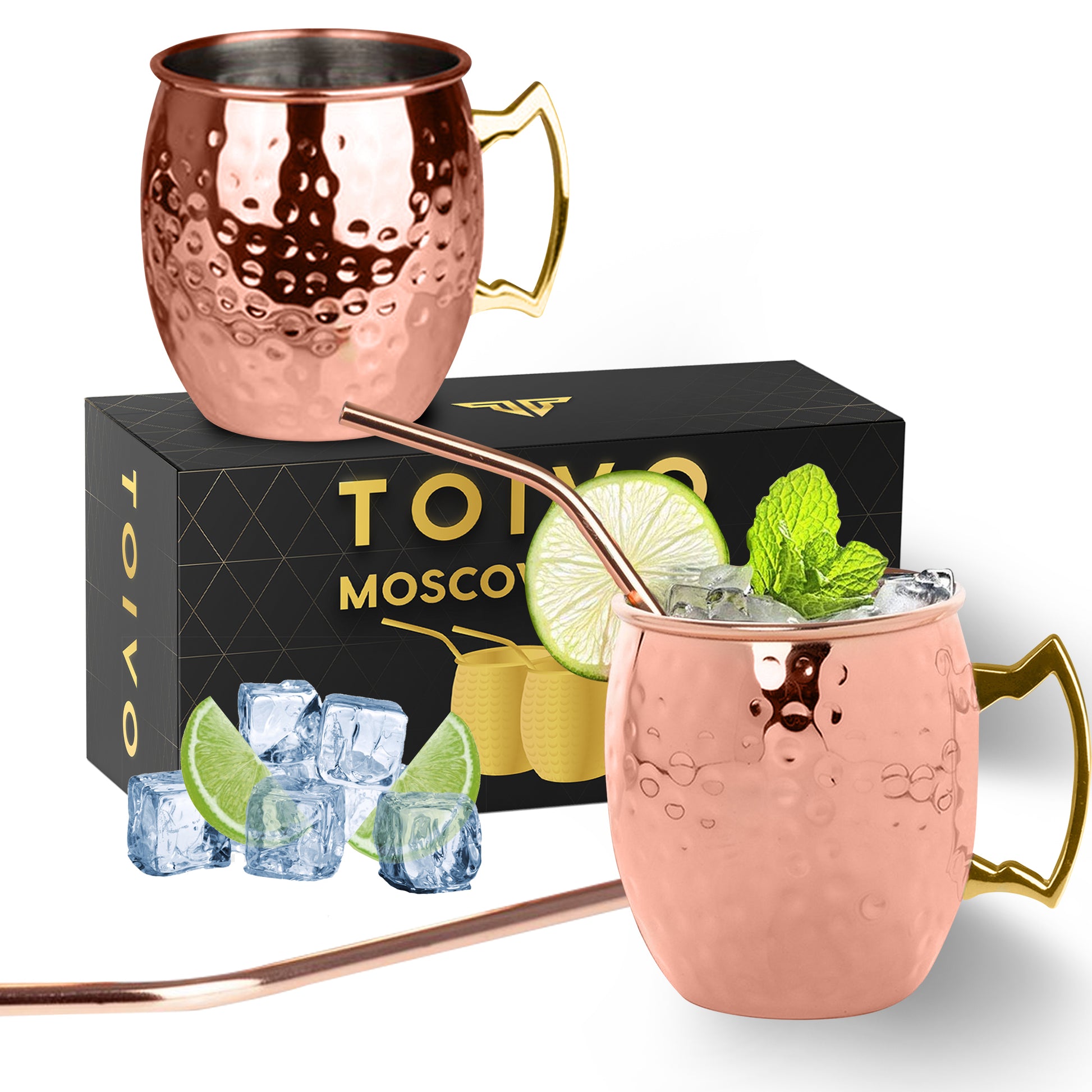 Toivo Moscow Mule Bekers DELUXE - Set van 2 Stuks - Inclusief RVS Rietjes- Koper