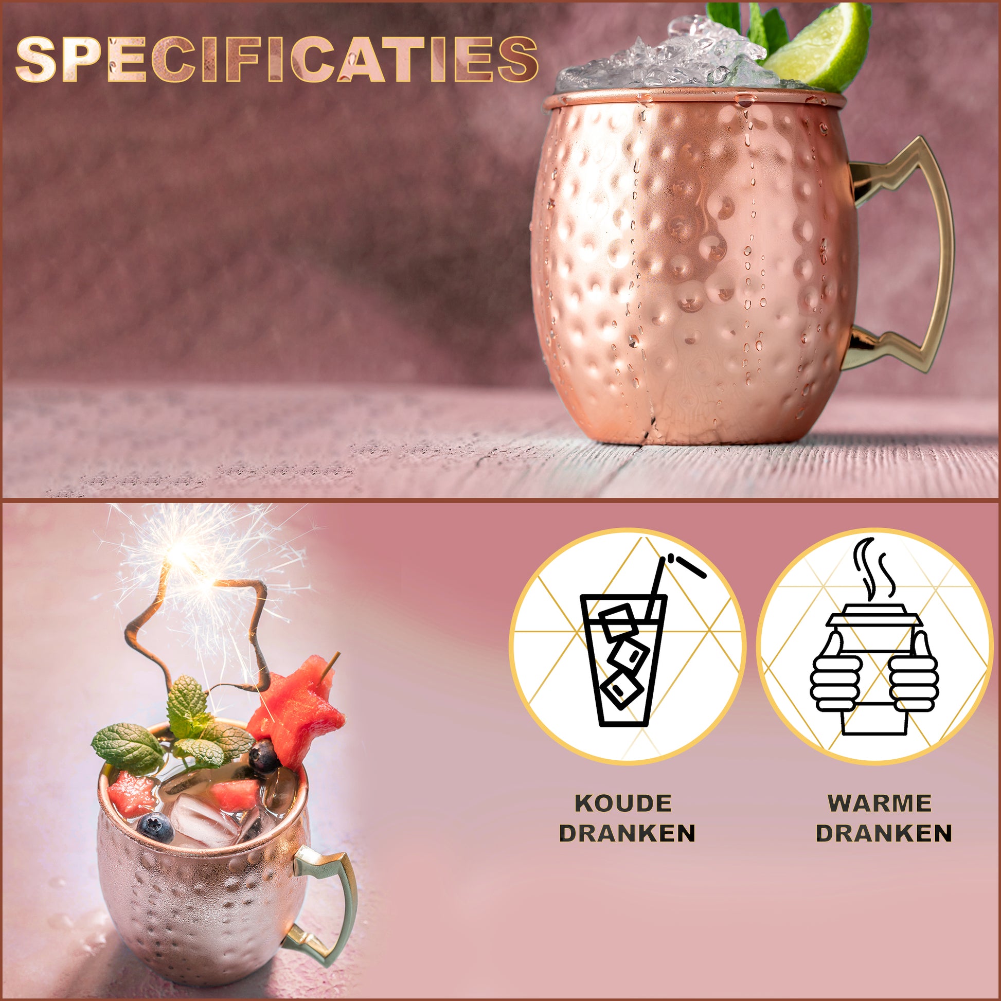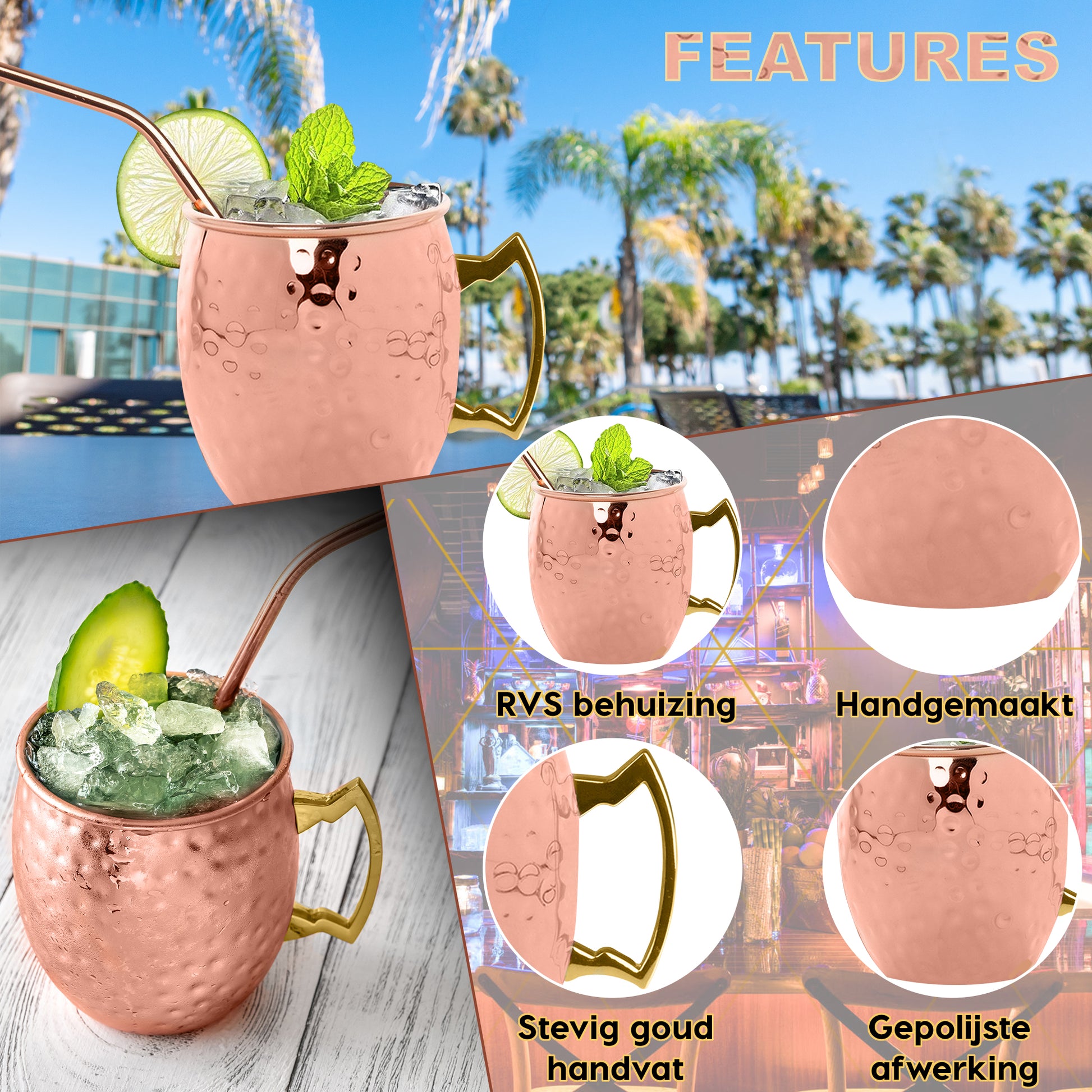 Serveer heerlijke cocktails zoals het hoort in een koperen trendy beker met koperen rietje. Geniet van de details van de handgemaakte koperen TOIVO Moscow Mule DELUXE bekers en laat jouw gasten genieten van pure luxe. De TOIVO Moscow Mule DELUXE bekers zijn Europees Geassembleerd en bevatten alle benodigde keurmerken Thuiswinkelwaarborg, NVWA (Voedsel en Warenautoriteit), CE.