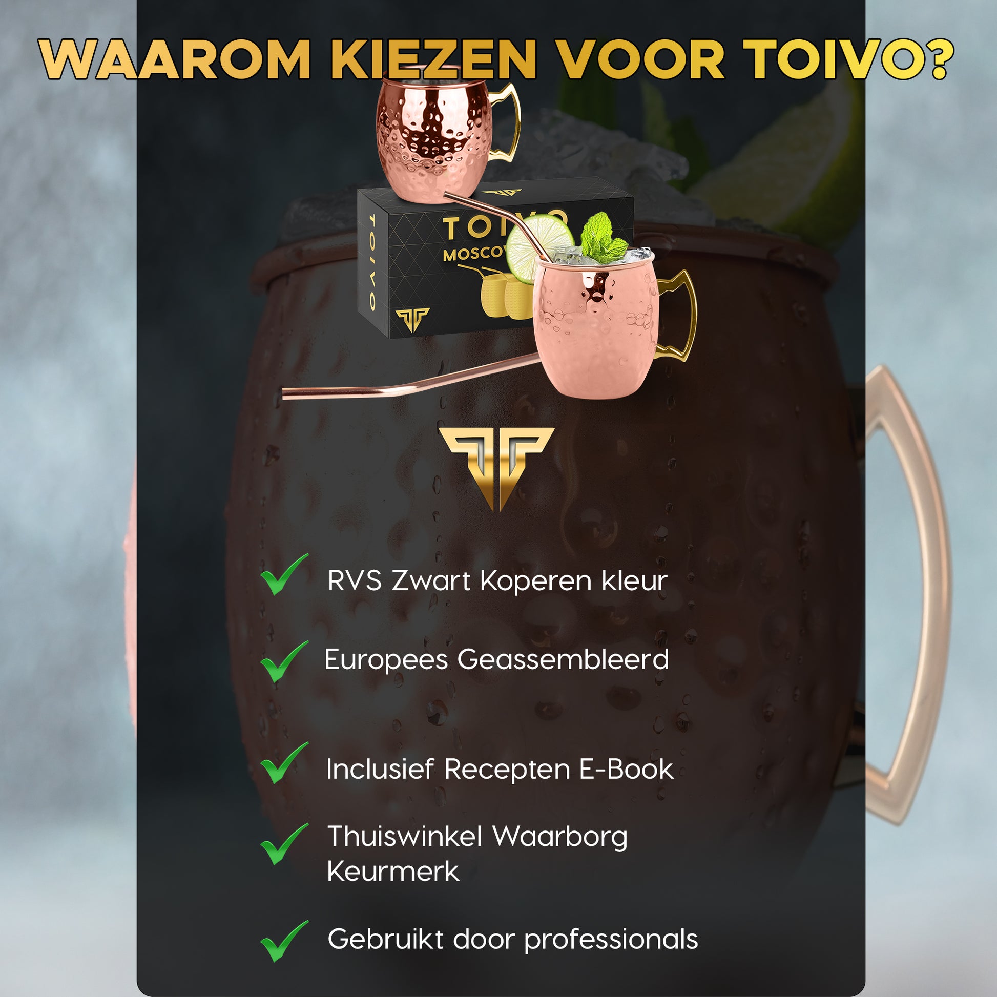 De set bevat twee TOIOV Moscow Mule bekers, Twee koperen rietjes, een TOIVO Handleiding en een GRATIS E-Book met daarin een heleboel recepten en tips voor dè perfecte cocktail!