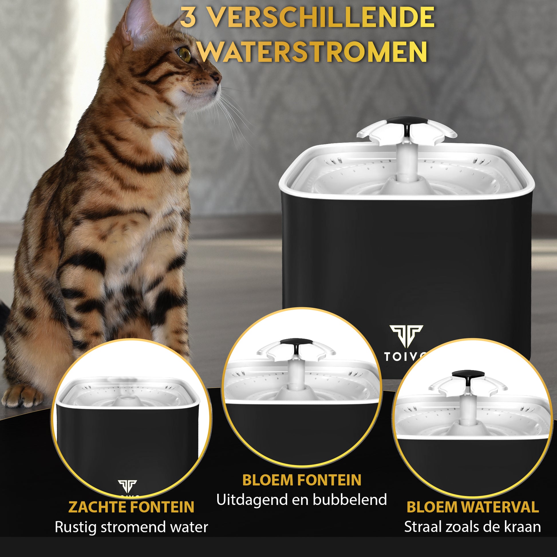 Bloemen waterval: Geeft een stroom zoals een bidet dat doet en is ideaal voor katten doordat deze "stromend" water insinctief verkiezen boven "stiltaand" water.