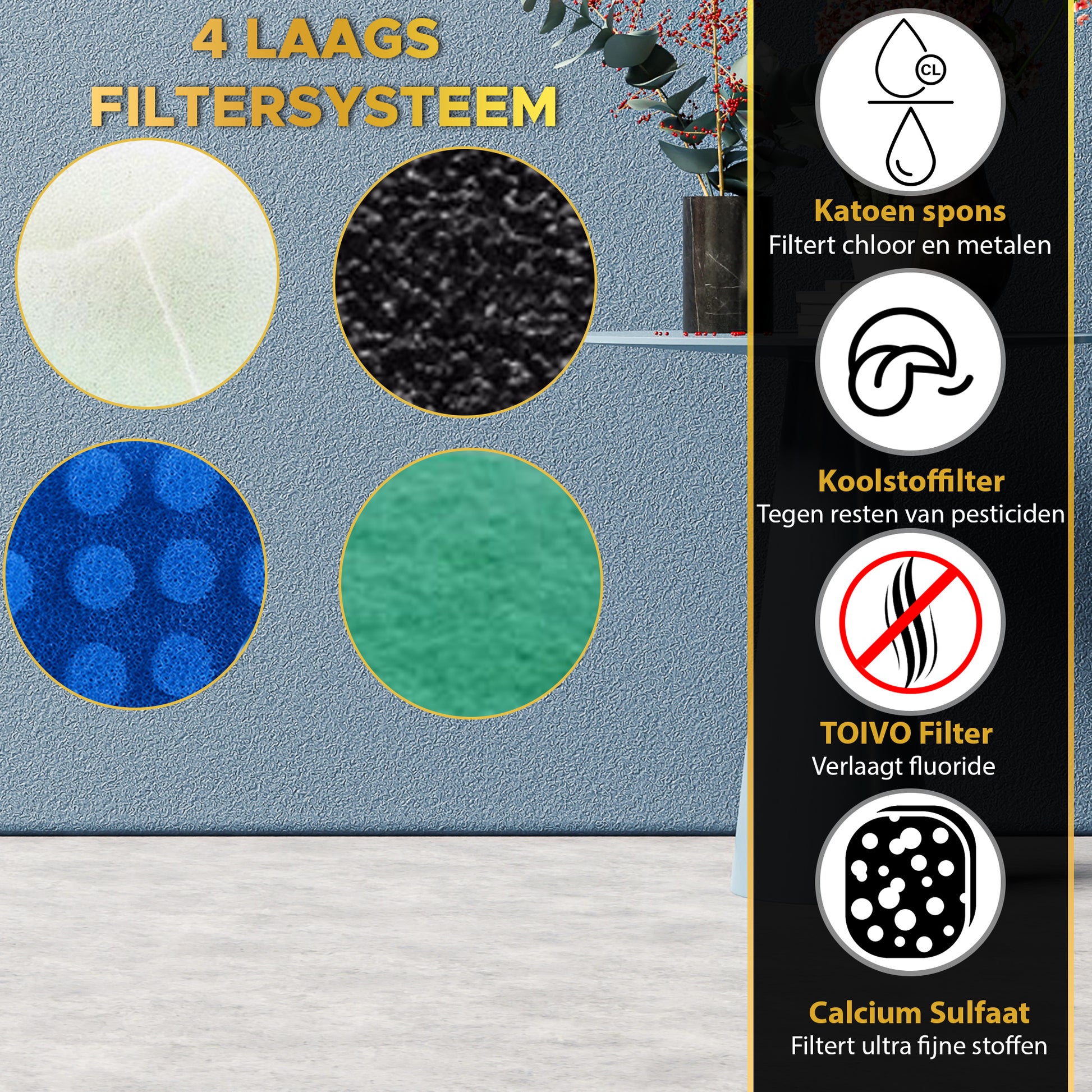 De TOIVO drinkfontein zorgt door middel van een koolstoffilter dat het water gefilterd wordt van kalk, viezigheid, smaakjes en geurtjes. Door de pomp blijft het water constant circuleren waardoor er meer zuurstof in het water komt en jouw huisdier voorzien is van het schoonste meest zuurstofrijke water. Er worden standaard vier koolstoffilters meegeleverd met de TOIVO Drinkfontein.