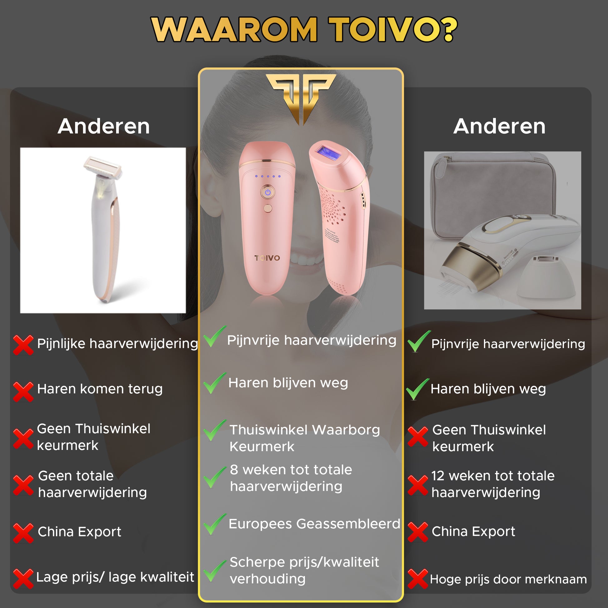 Ben jij klaar met de irritaties die ontstaan bij het scheren van jouw benen? Wil jij geen vervelende en pijnlijke ervaring meer hebben wanneer jij jouw benen harst? Jouw haren weghouden in plaats van elke keer opnieuw te moeten behandelen? Dan is de TOIVO IPL 763 PRO perfect geschikt voor jou! Met zijn 900.000 flitsen en unieke gepattenteerde IV-Laser haal jij jouw haren pijnvrij, snel en veilig weg!