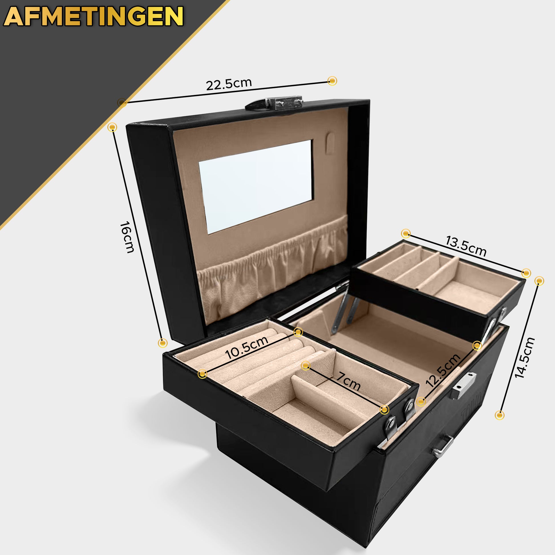 De TOIVO XL Sieradendoos heeft drie verschillende lagen die bestaan uit 2 lades, 2 zij-compartimenten, meerdere armbandhouders en diverse opbergbakjes. Zo kan jij letterlijk alles op een vaste plek bewaren!