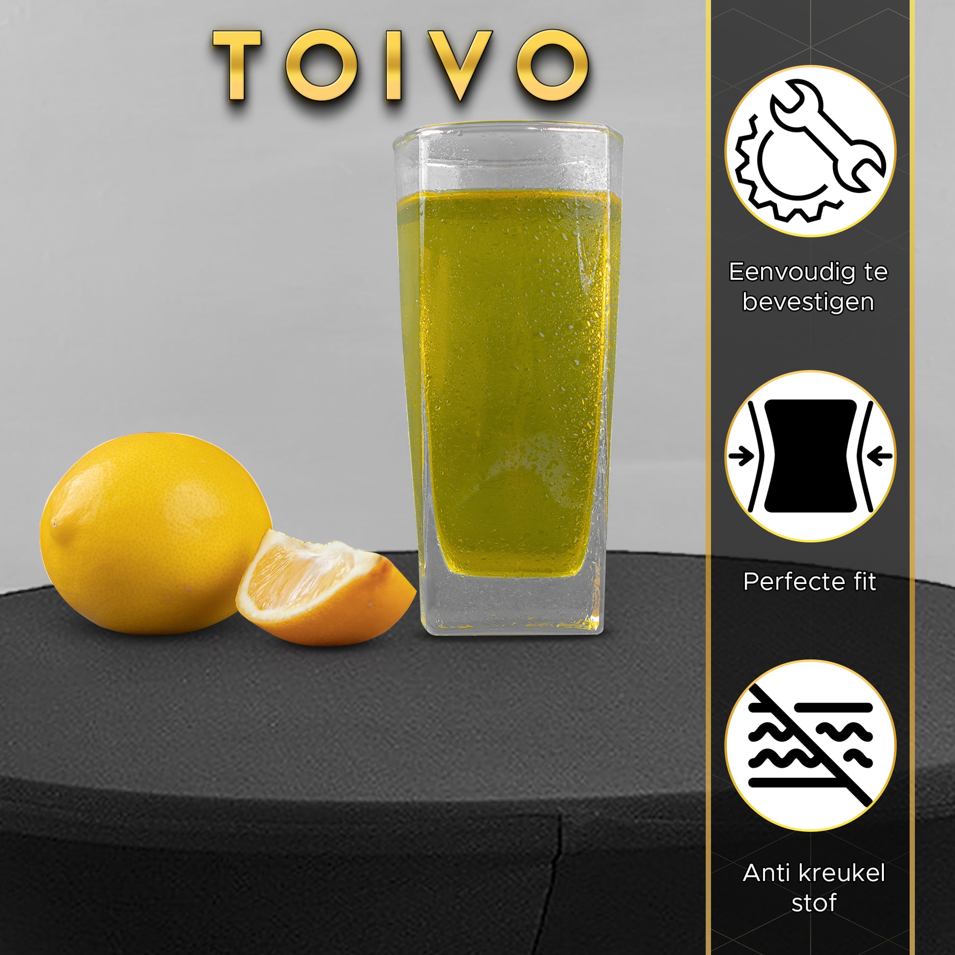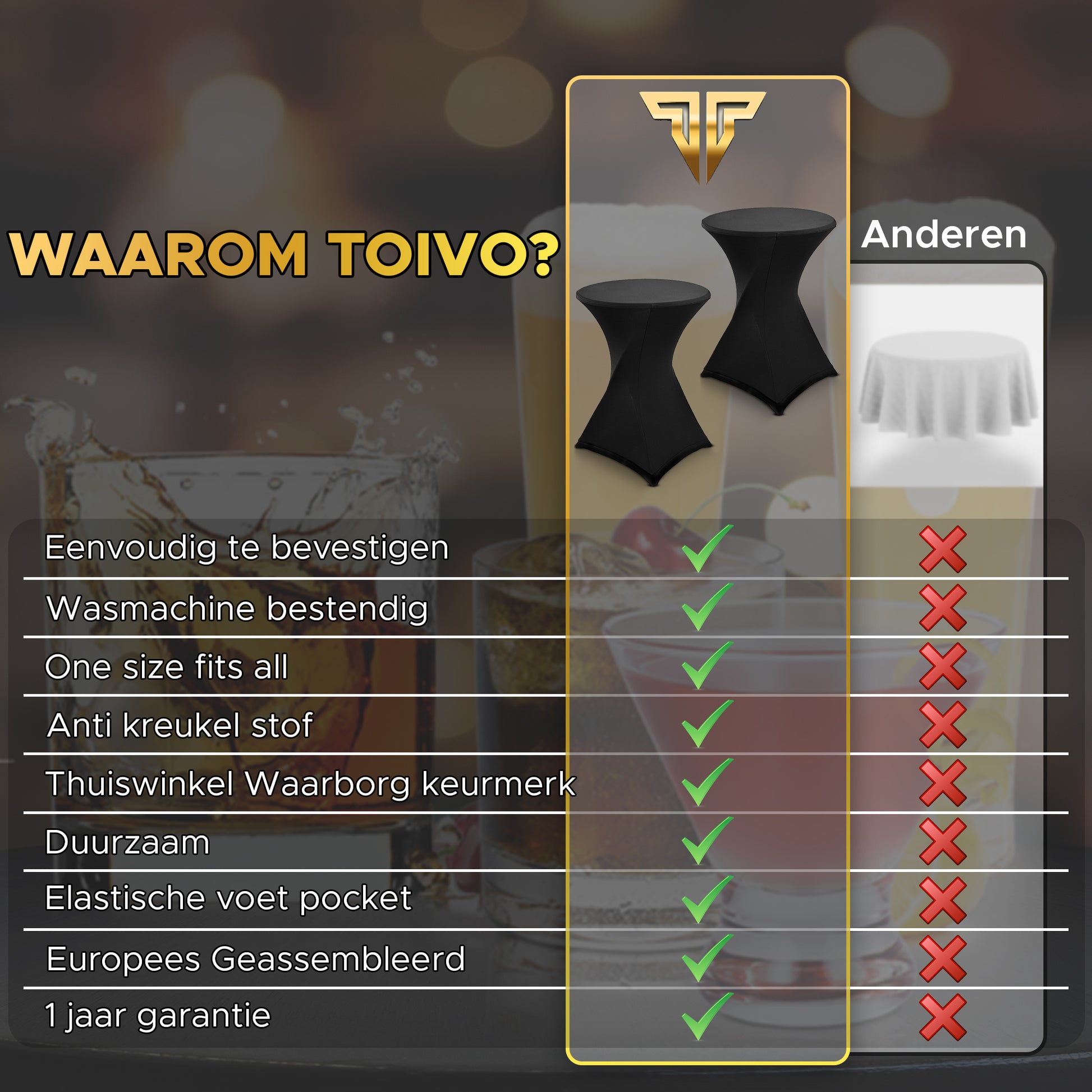 De TOIVO Statafelrok voor cocktailtafels is van hoge kwaliteit, schijnt niet door en geeft een luxe uitstraling. Door gebruik te maken van 10% spandex en 90% polyester ben jij er van verzekerd dat deze hoes over vrijwel elke cocktail tafel past. De tafellakens zijn afgewerkt met een anti kreukel laag en zijn vlekbestendig. Hierdoor kan jij na jouw feestje ook nog gebruik blijven maken van de TOIVO tafellakens. De TOIVO Statafel rok set wordt daarnaast duurzaam geproduceerd en bevat het Thuiswinkel Waarborg keurmerk.