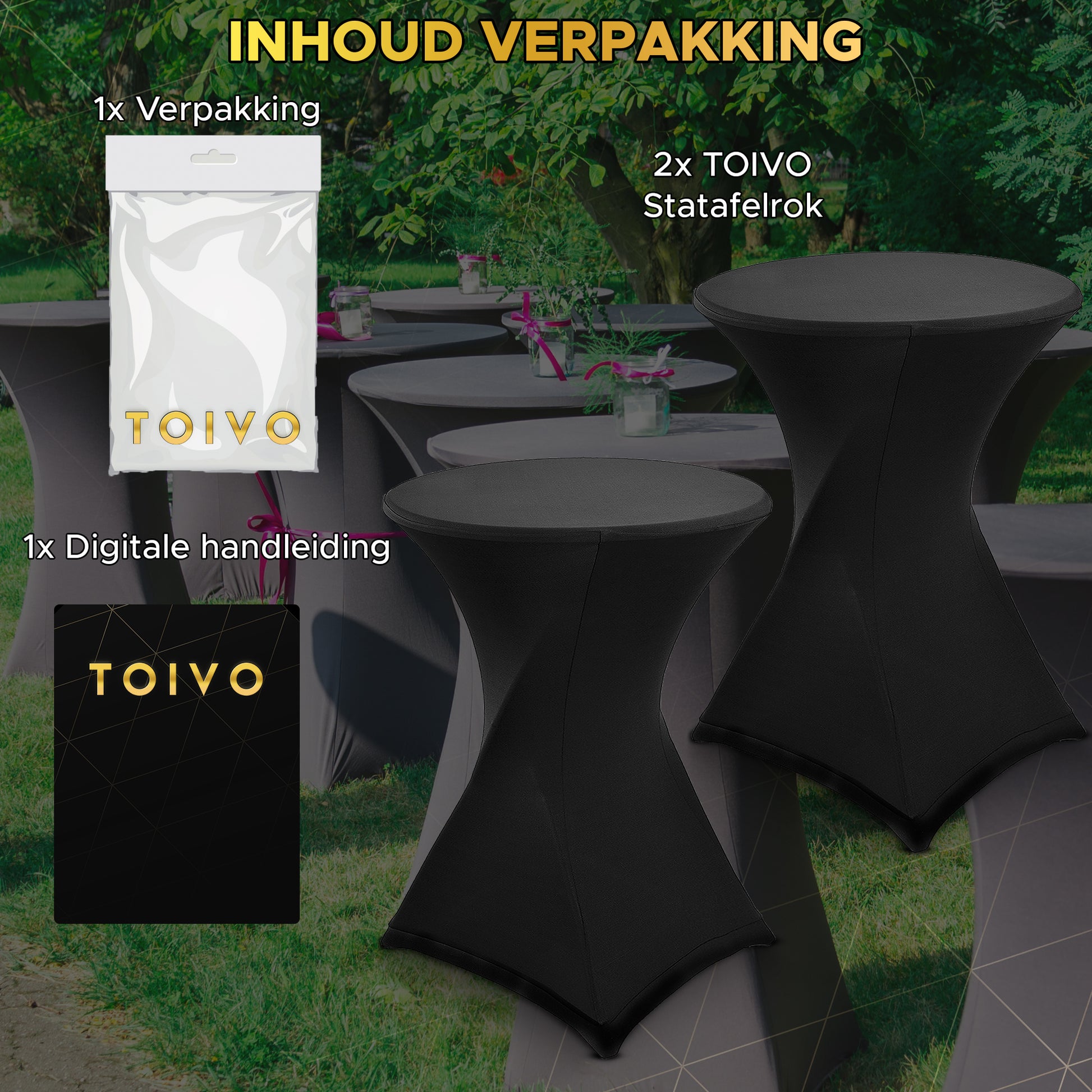 De TOIVO Statafelrok set van 2 heeft een afmeting van 80x110cm en kan gebruikt worden op een standaard cocktail tafel. De tafellakens bevatten daarnaast 4 elastische zakken waardoor tafelpoten eenvoudig in het laken geschoven kunnen worden en deze goed om de tafel blijven zitten. Zo ben jij er van verzekerd dat het tafellaken niet gaat schuiven of los komt te zitten!
