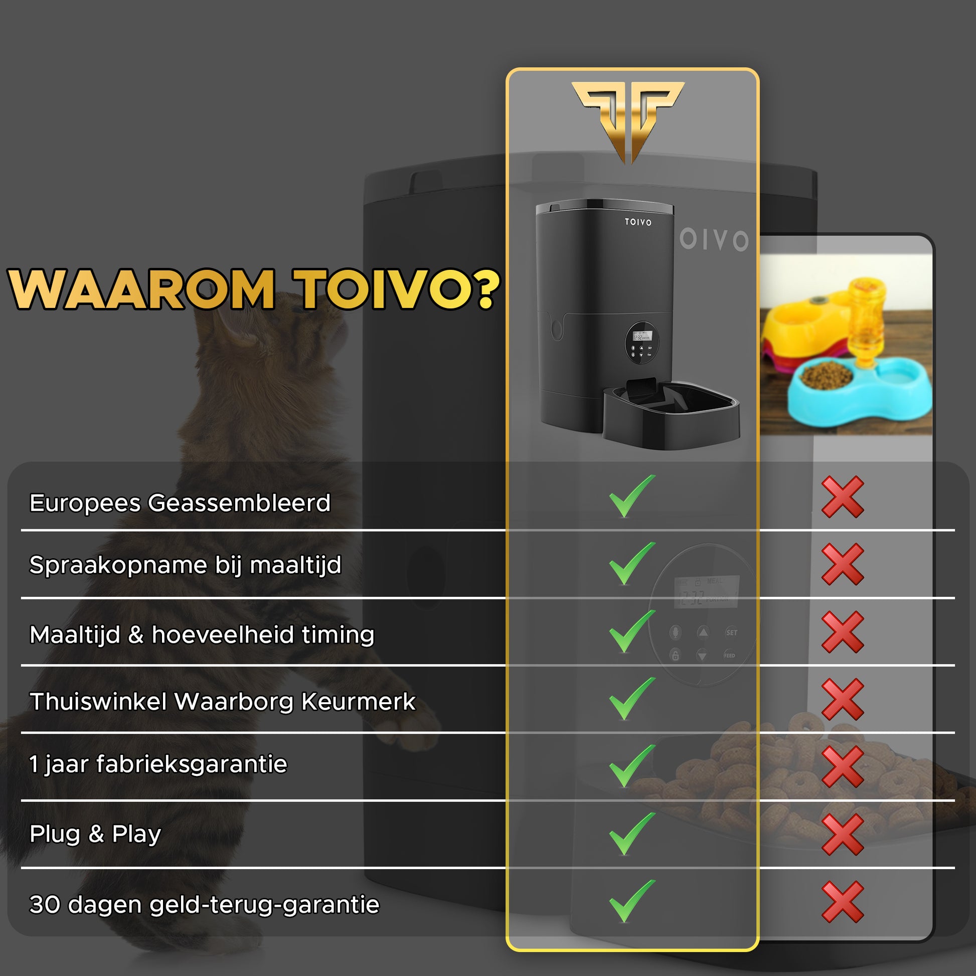 Wil jij jouw huisdier op elk gewenst moment voorzien van eten? Je geen zorgen hoeven maken wanneer jij een keer een avond of dag weg bent? Geen gedoe met het downloaden van een app om jouw kat te voorzien van eten? Genieten van Europees Geassembleerde kwaliteit tegen een scherpe prijs? Dan is de TOIVO Voerautomaat 4L PRO perfect geschikt voor jou!